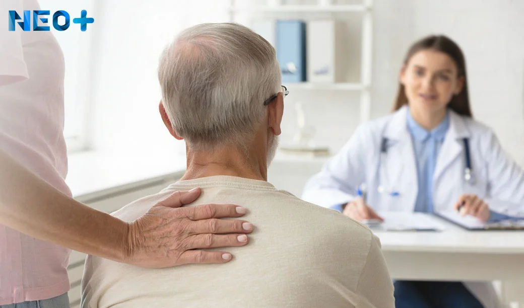 Родственник с пожилым человеком перед врачом